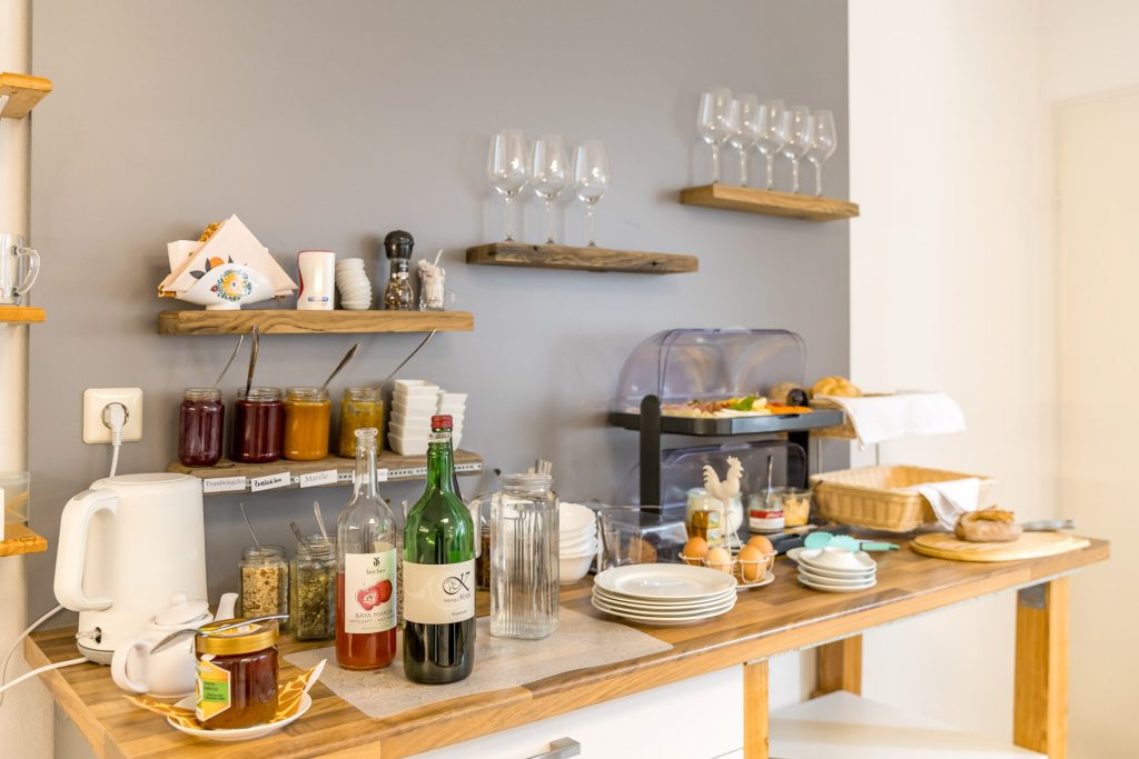 Bedienen Sie sich tagsüber und am Abend nach Lust und Laune an der Kaffeemaschine bzw. am Weinschrank.